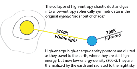 That’s a problem for cosmology. We need to explain how a universe beginning in thermal equilibrium with maximum entropy (total disorder) can create a spherically symmetric star sending a stream of negative entropy to Earth.